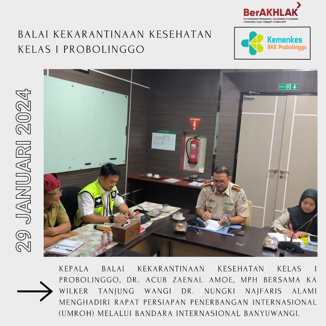 KEPALA BALAI KEKARANTINAAN KESEHATAN KELAS I PROBOLINGGO, DR. ACUB ZAENAL AMOE, MPH BERSAMA KA WILKER TANJUNG WANGI DR. NUNGKI NAJFARIS ALAMI MENGHADIRI RAPAT PERSIAPAN PENERBANGAN INTERNASIONAL (UMROH) MELALUI BANDARA INTERNASIONAL BANYUWANGI.